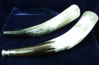 Rufhoerner, auch Blashoerner oder Signalhoerner genannt, sind aussen genauso schoen poliert wie unsere Trinkhoerner, doch werden sie nicht lackiert, und haben statt einer Spitze eyne