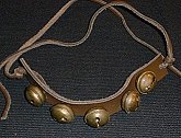 Schellenband “Eyn Lederband wie aus alten Tagen - eynfach, und doch schoen zu tragen !” 5 Messing-Schellen mit Patina, auf eynem